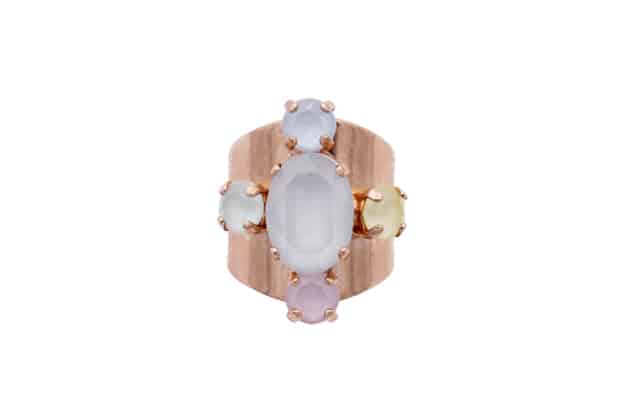 La bague BEREN, ici portée par Lola, est une interprétation du minimalisme bohémien. Elle est sertie d’un oval central et de cristaux opalescents en camaïeu de pastels ocres et rosés dans une composition harmonieuse. Sa forme épurée est empreinte d’une touche de romantisme. Elle se porte seule ou en accumulation pour habiller la main de jour comme de nuit.