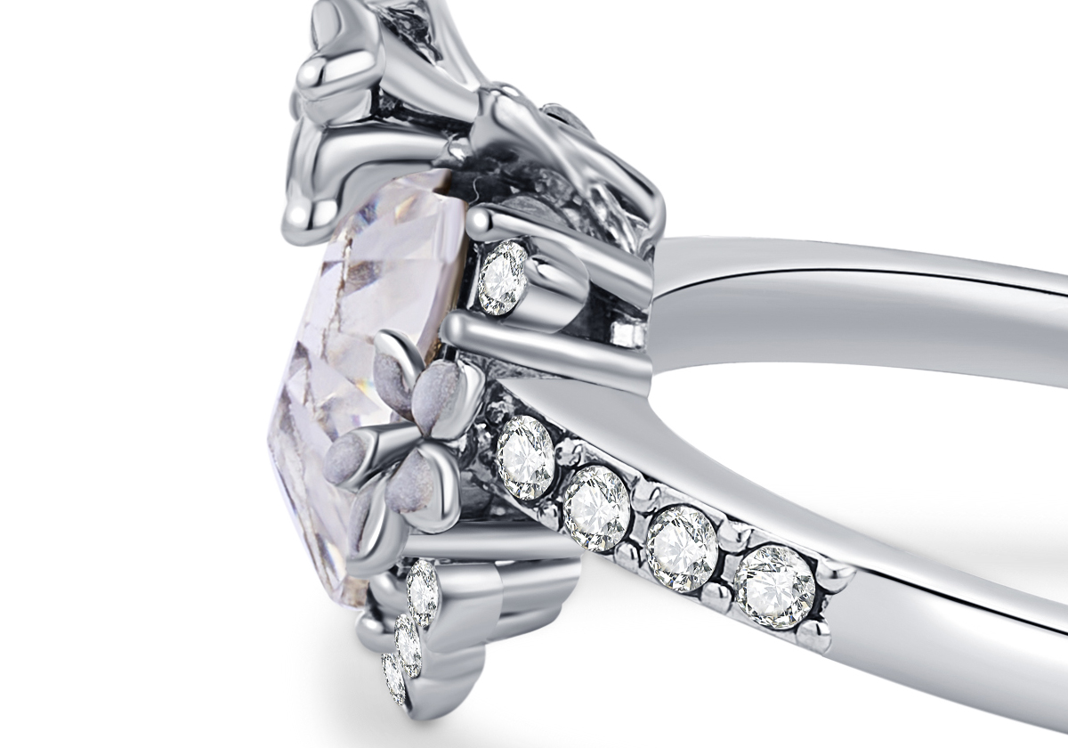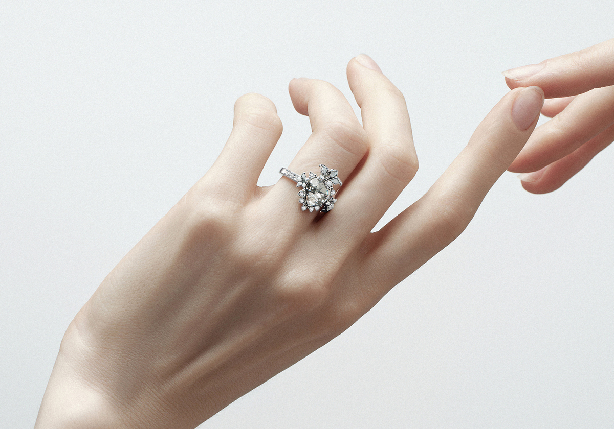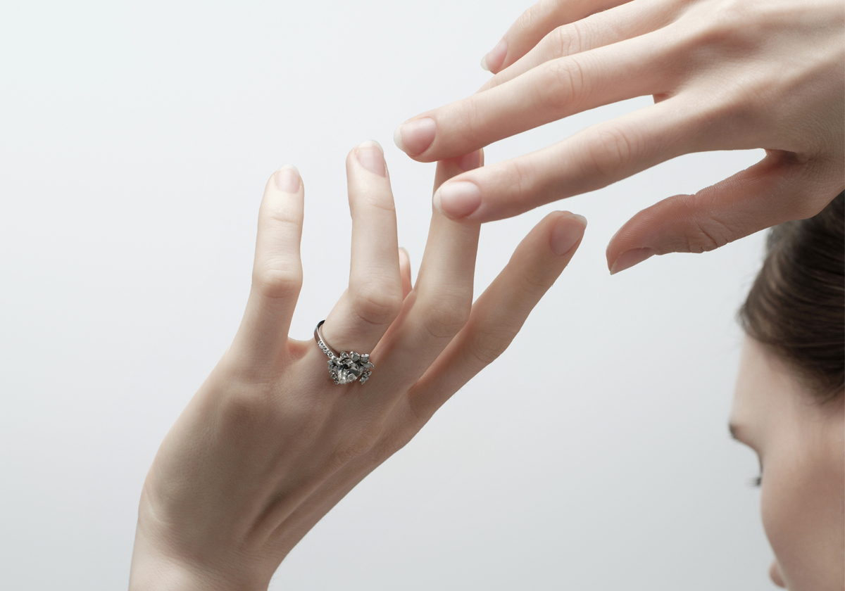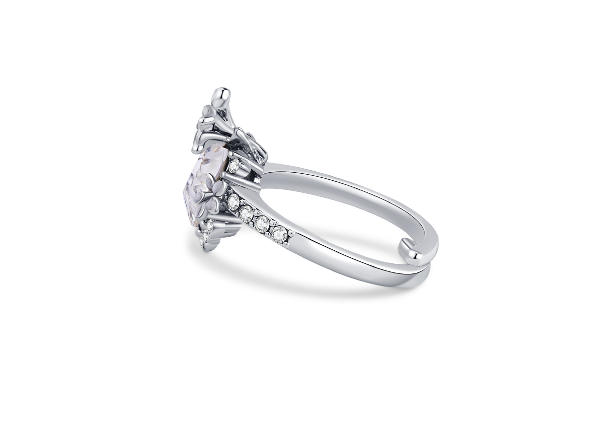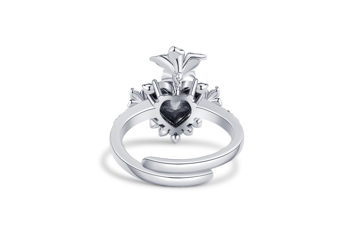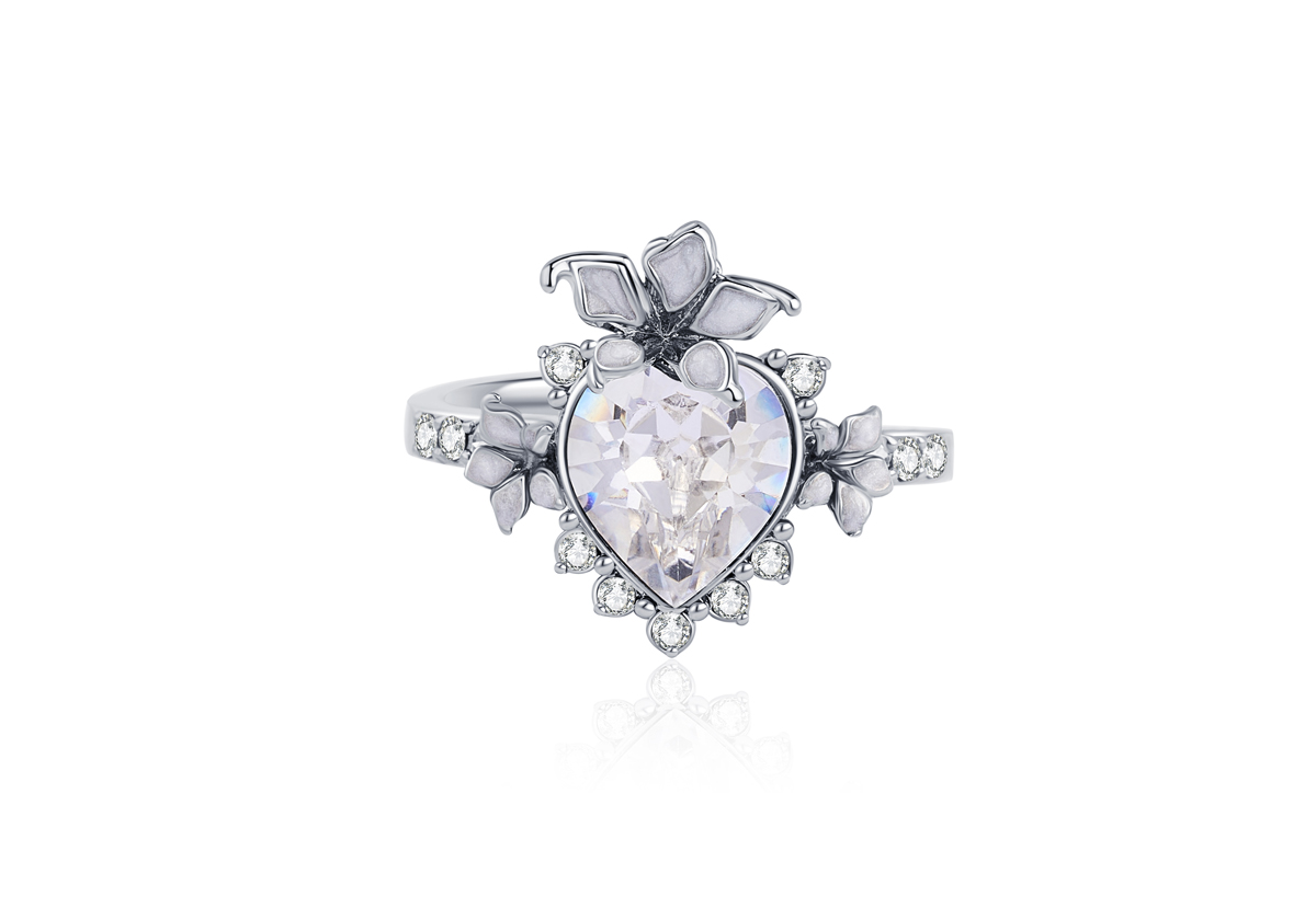 La bague Lika, ornée d’un cœur central pavé de cristaux, se distingue par ses fleurs de datura délicatement émaillées de blanc aux reflets irisés. Sculpturale et affirmée, elle révèle une féminité magnétique au caractère singulier.