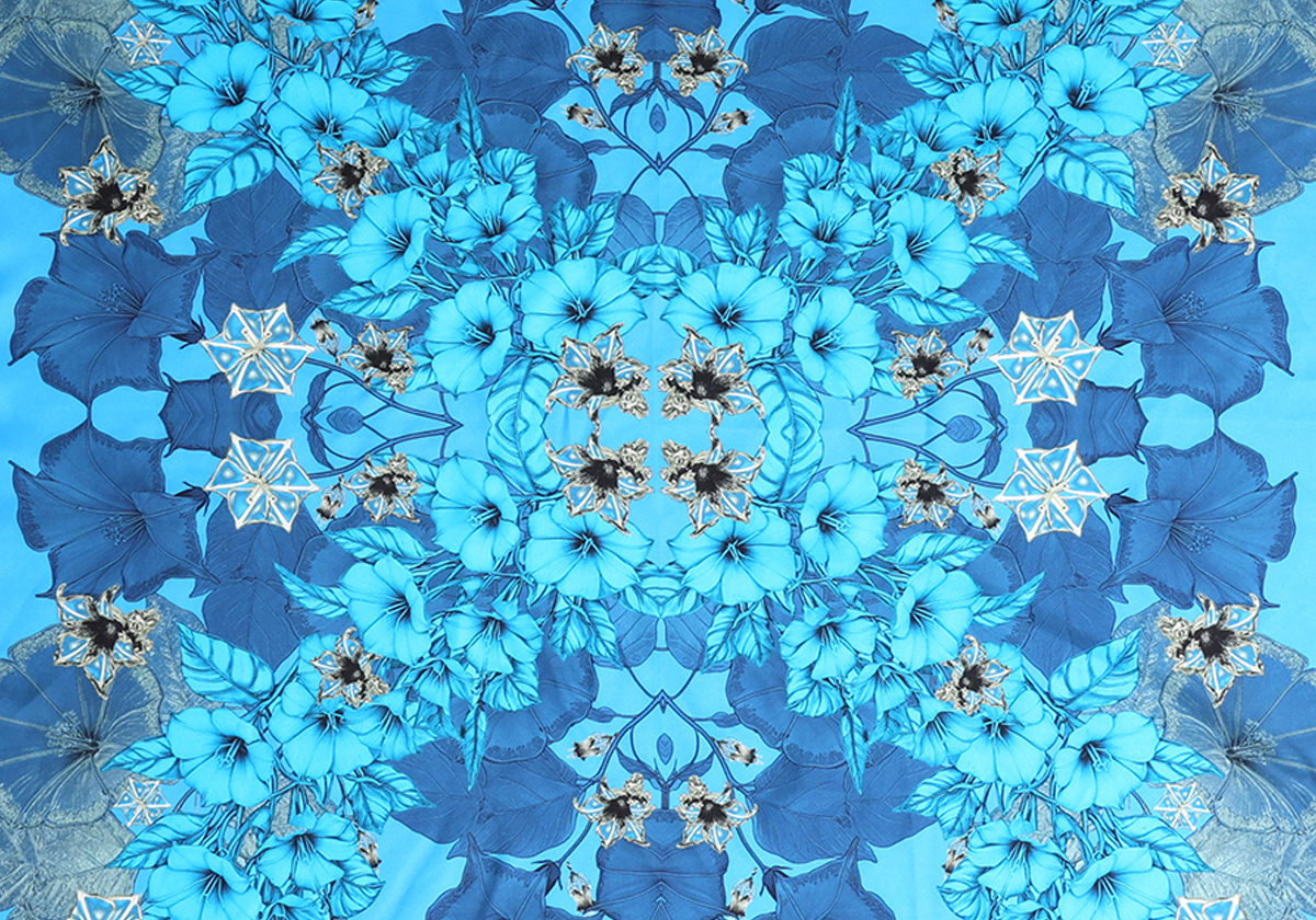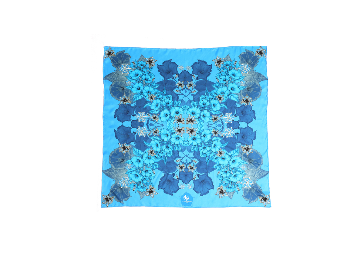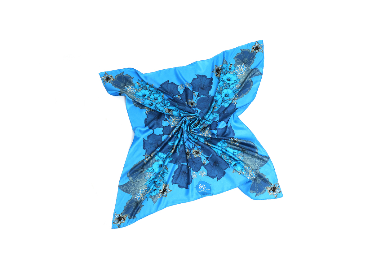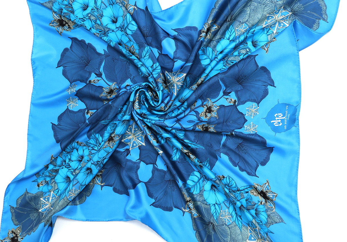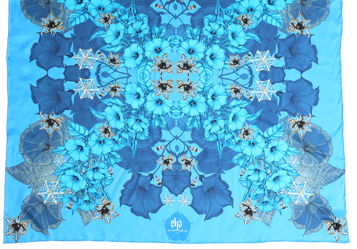 Le Carré Blue Zeal exprime une féminité magnétique et une élégance affirmée. Décliné dans des nuances de bleu profond et lumineux, il ouvre le champ des possibles : celui d’une création en perpuelle transformation, d’une émotion sans limite, d’un geste singulier qui esquisse une histoire personnelle.