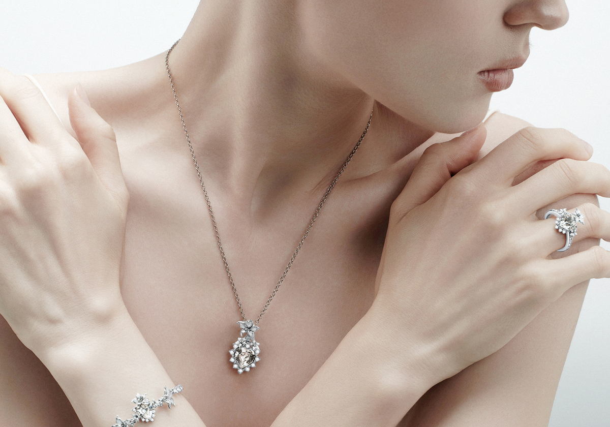 Le collier Aloal, orné d’un cœur central pavé de cristaux, se distingue par ses fleurs de datura délicatement émaillées de blanc aux reflets irisés. Sculptural et raffiné, il révèle une féminité magnétique et affirmée.