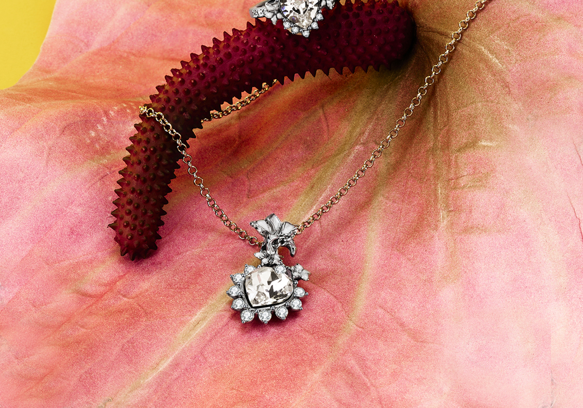 Orné de motifs de datura et suspendu à une chaîne en métal réglable, il séduit par la finesse de son émaillage irisé. Réalisé en métal et pavé de cristaux, ce collier témoigne d’un savoir-faire d’exception et d’une audace résolument contemporaine.