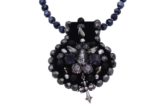 Le collier ASTI est une pièce unique entièrement réalisée à la main. À mi-chemin entre le sautoir et le plastron, ce bijou se compose d’une base textile doublée de velours noir aux contours brodés de petites perles de couleur anthracite. Son centre est rehaussé d’un élément de bijouterie, duquel pend une petite croix, en argent vieilli, ornée de différents cristaux. Quelques clous métalliques argentés parsèment le tout. Sa longue chaine est constituée de petites perles sombres aux reflets bleutés et d’un fermoir réglable.