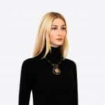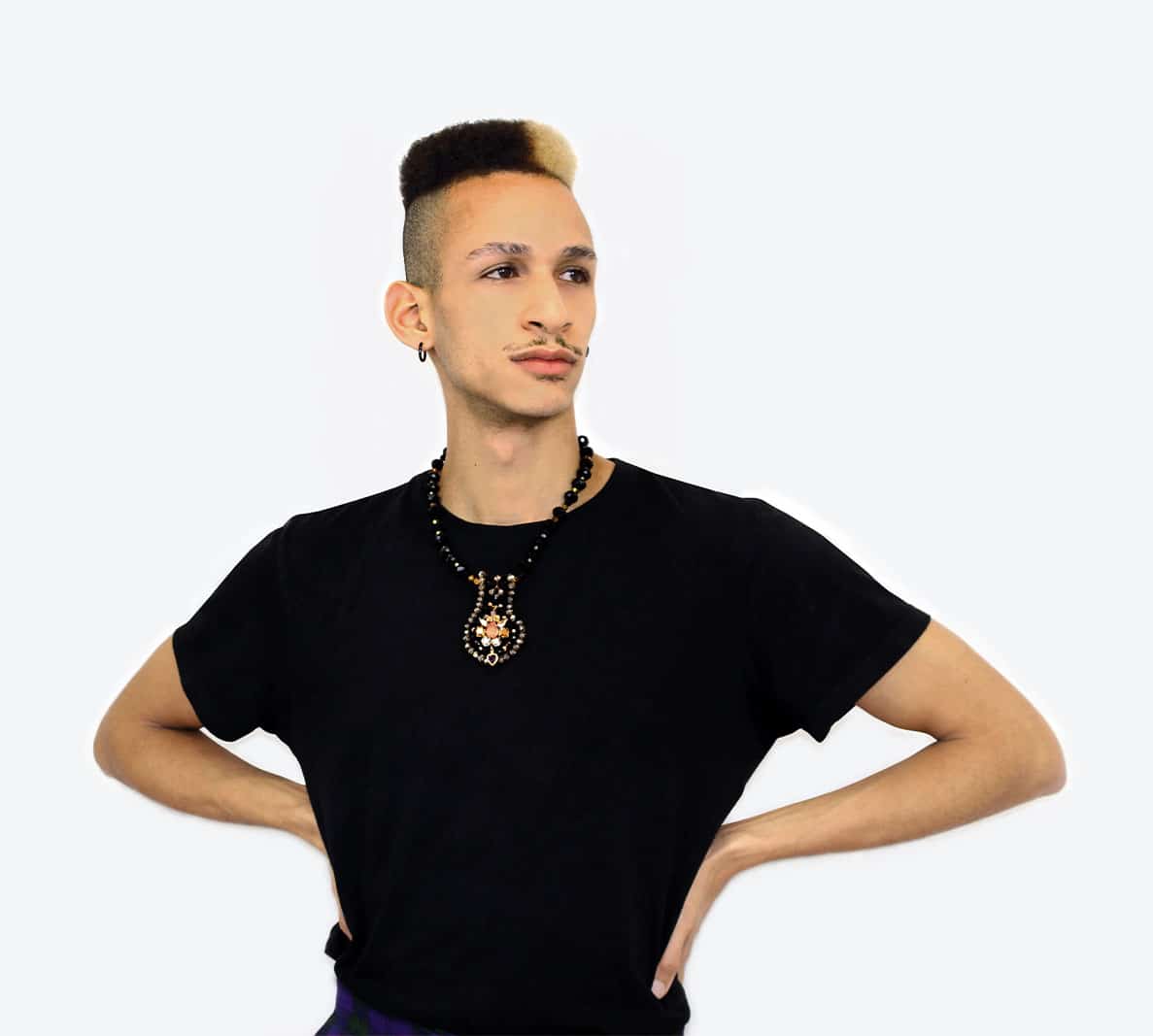 Le collier AXIL, ici porté par Evan et Betty, est une pièce unique entièrement réalisée à la main. À mi-chemin entre le sautoir et le plastron, ce bijou se compose d’une base textile doublée de velours noir et brodé de perles irisées semi-transparentes et de clous métalliques dorés. Un élément central de bijouterie, en métal plaqué rose gold, est serti d’un pendentif en cristal prenant la forme d’un cœur pourpre. Il est agrémenté de cristaux de tailles et de formes différentes dans un camaïeu de rose, orange et ocre. La chaine est constituée de perles noires imposantes.