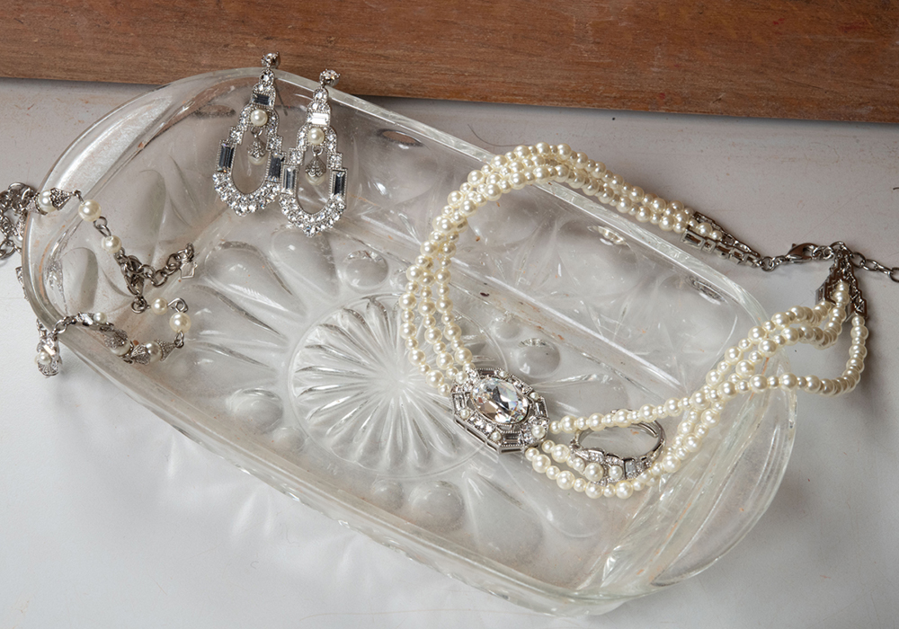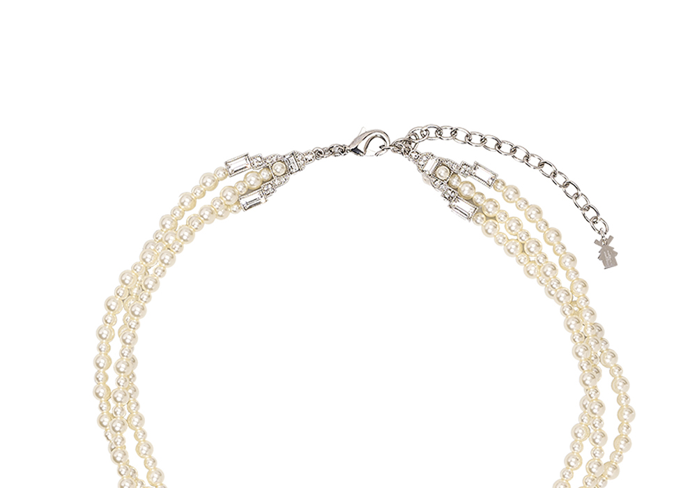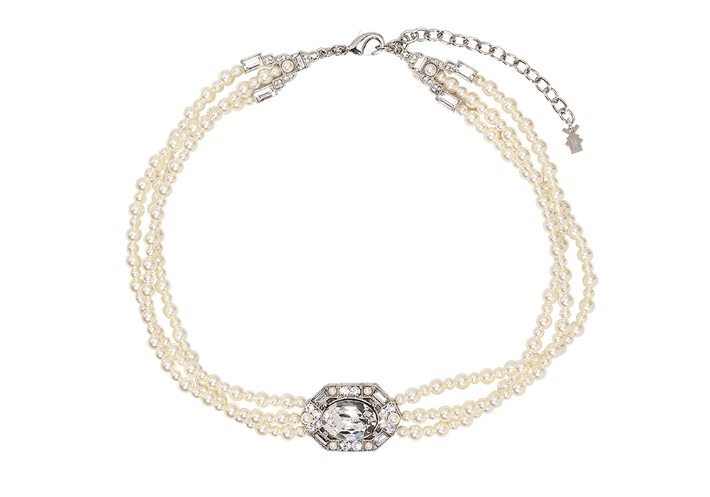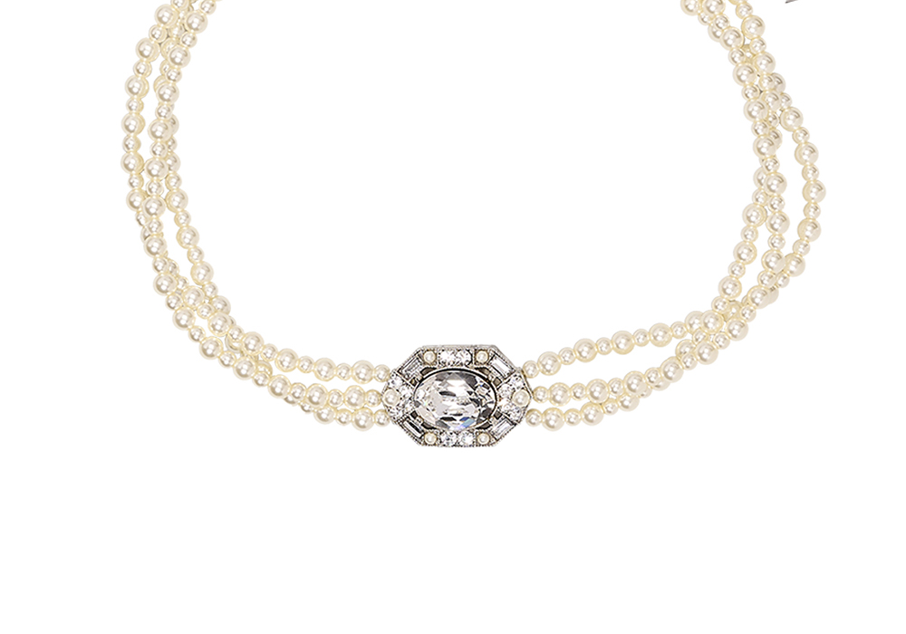 Collier Viala choker en perles nacrées et cristaux facettés ovales et rectangulaires — Collection MUSE, Moulin Rouge® by On Aura Tout Vu. Éclatant et intemporel, le choker Viala mêle la douceur des perles nacrées à la brillance de cristaux facettés aux lignes ovales et rectangulaires.