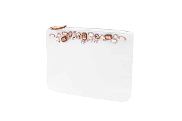 La pochette CARTA en cuir blanc brodé de cristaux blancs et champagne est réalisée par les ateliers de la maison On Aura Tout Vu. Pratique et esthétique elle peut s’utilise comme pochette pour accompagner vos tenues de jour ou du soir ou bien comme trousse à maquillage ou à petits objets du quotidien.