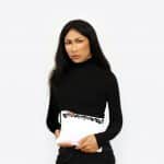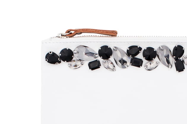 La pochette COMOL est ici portée par Ratha. En cuir blanc brodé de cristaux gris, noirs et blancs, elle est réalisée par les ateliers de la maison On Aura Tout Vu. Pratique et esthétique elle peut s’utilise comme pochette pour accompagner vos tenues de jour ou du soir ou bien comme trousse à maquillage ou à petits objets du quotidien.