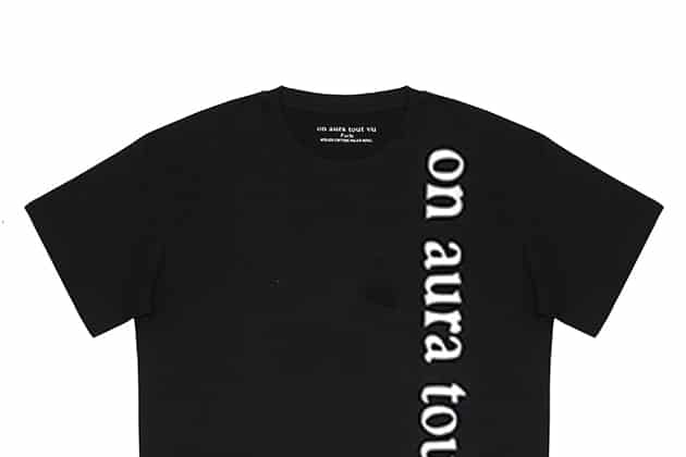 Le t-shirt ARMSTRONG est confectionné en jersey de coton noir, doux et léger. Sa coupe droite est complétée d’une encolure ronde à finition côtelée. Il est rehaussé d’une sérigraphie du logo ON AURA TOUT VU vertical blanc.